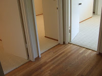 We were wondering why we didn't get carpeting in the hallway too. I guess if we got hallway carpeting, then we might as well have gotten carpeting in the living room, dining room, and family room too. But I do like having hard wood floors, even if they're not very nice hardwood floors (they need refinishing, especially in that middle bedroom in the photo above). And I figure I can better see M's food droppings on hardwood floors.